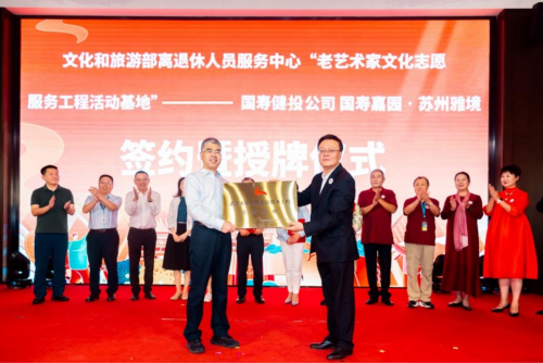阅尽姑苏万千华彩,领略苏州一方山水,品味水乡珍馐风物,赴场江南清秋雅事。2023年9月25日,正值中秋、国庆双节来临之际,文化和旅游部离退休人员服务中心老艺术家文化志愿服务工程走进国寿嘉园·苏州雅境,开展“文化服务人民 助力文化养老”文化志愿服务活动,并为在国寿嘉园·苏州雅境建立的“老艺术家文化志愿服务工程活动基地”揭牌。国寿健康产业投资有限公司、文化和旅游部离退休人员服务中心、国寿嘉园(苏州)养老管理有限公司相关领导以及中国歌剧舞剧院国家一级演员李元华、中国国家话剧院国家一级演员沙景昌等老艺术家们出席了活动。