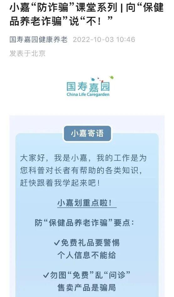 老人不安则家庭不安,家庭不安则社会不安。近年来,诸多不法分子多以老年群体为目标,打着义务诊疗、心理关爱、志愿陪护的幌子,获得老年人信任后,以多种形式对老年人实施诈骗。为助力国家营造安享幸福晚年的良好社会环境,落实防诈骗宣传教育活动,国寿嘉园在重阳节前后通过线上平台创新形式,开展了系列“防诈骗”课堂,针对老年群体常见的保健品骗局、中奖诈骗、投资诈骗等骗局类型,向长者普及防诈骗知识,帮助长者坚决守护好自己的“钱袋子”。