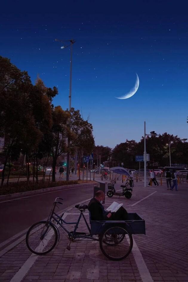 来自参与用户@笑笑:深秋的傍晚,人来人往的路边,有月,有书,有老人。那一刻的抚慰胜过千言万语。