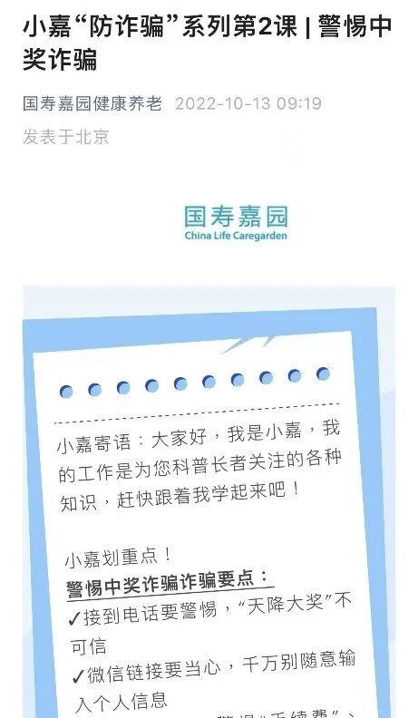 国寿嘉园,作为积极老龄观的倡导者、先行者和实践者,积极开展防诈宣传,在线上新媒体平台以老年人易于解读的漫画形式,分享养老诈骗的典型案例,并以案例分析的形式开展防诈骗知识科普,提示老年人擦亮双眼、提高警惕,避免上当受骗。