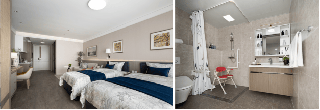 呼叫、智能娱乐、视频互动、家居控制等功能;房间内随处可见紧急呼救按钮,浴室扶手和座椅的设置都突出设计的安全性、人性化、适